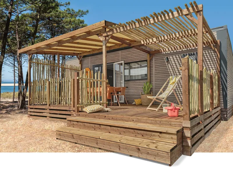 Ebène | Terra : terrasse partiellement couverte toit Sunny avec côté pare-vue et partie non couverte L. 2,50 m avec son escalier podium – 2 rambardes au choix - soubassements de série :