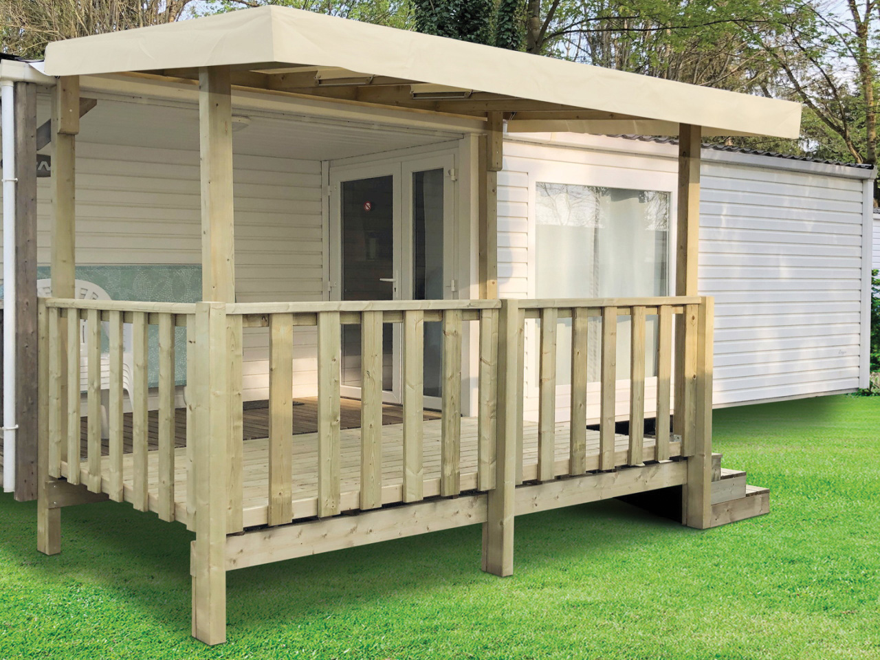 Prolongez votre terrasse bois de mobil-home avec terrasse intégrée avec l'ajout d'une extension couverte, facile à installer.
