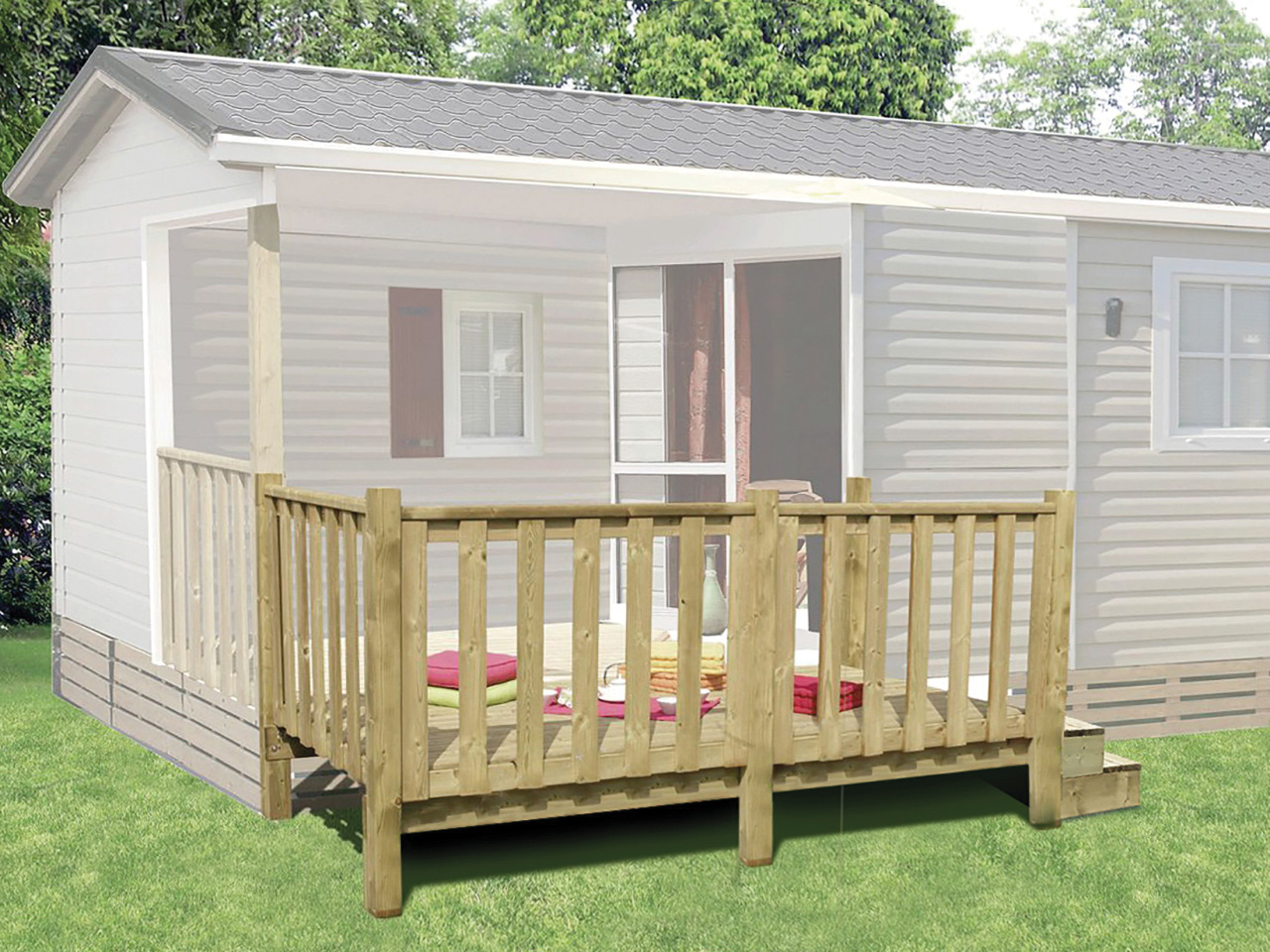 Prolongez votre terrasse bois de mobil-home avec terrasse intégrée avec l'ajout d'une extension terrasse non couverte, facile à installer