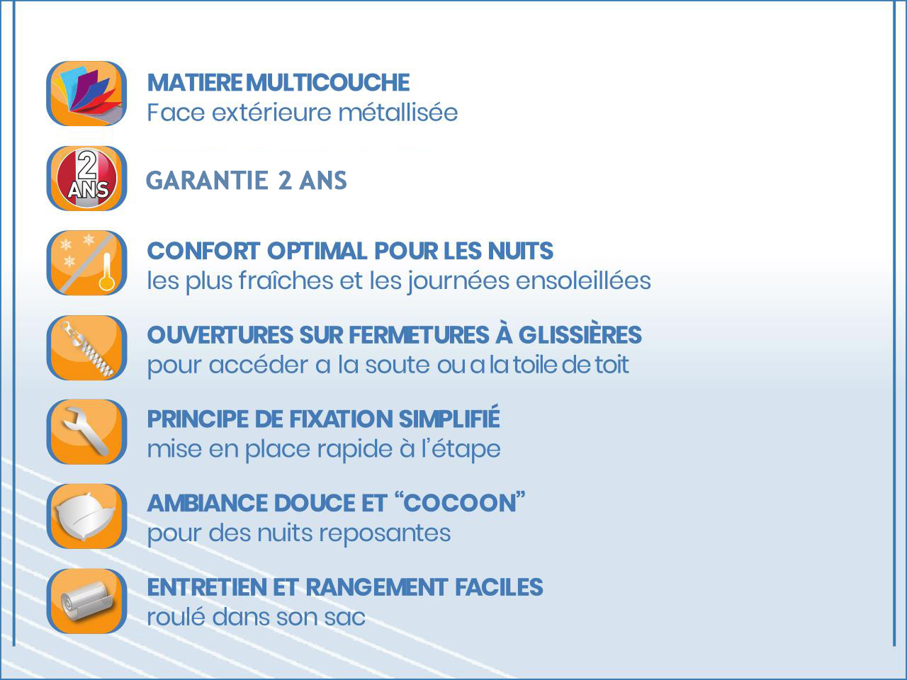- Opaque, il améliore l’obscurité de l'habitacle pour davantage de confort nocturne. Traité anti UV et résistant, il conservera toutes ses qualités au fil du temps.