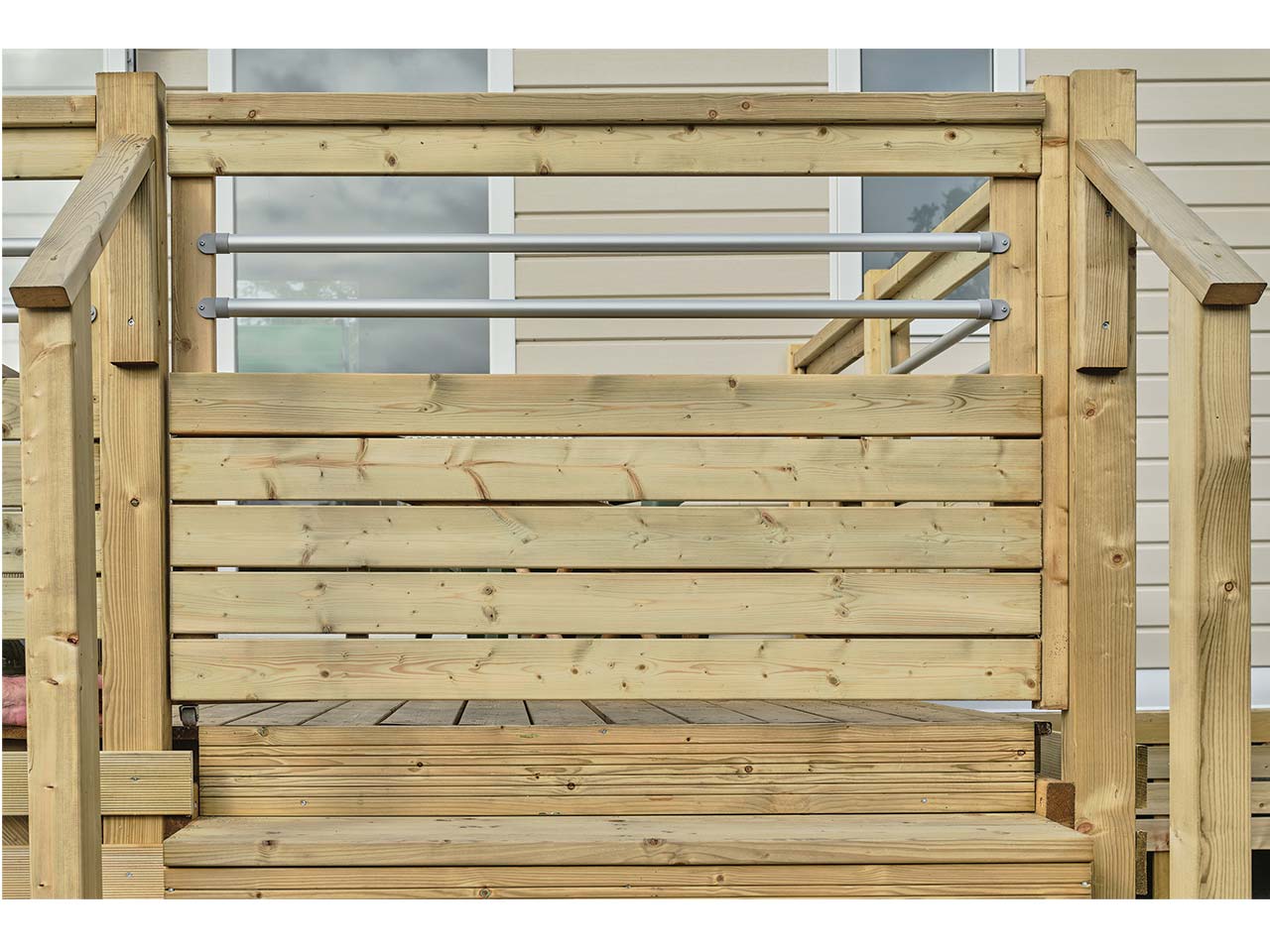 En bois traité autoclave, cette barrière est livrée pré-assemblée et s'intègre parfaitement dans la continuité des rambardes de votre terrasse.