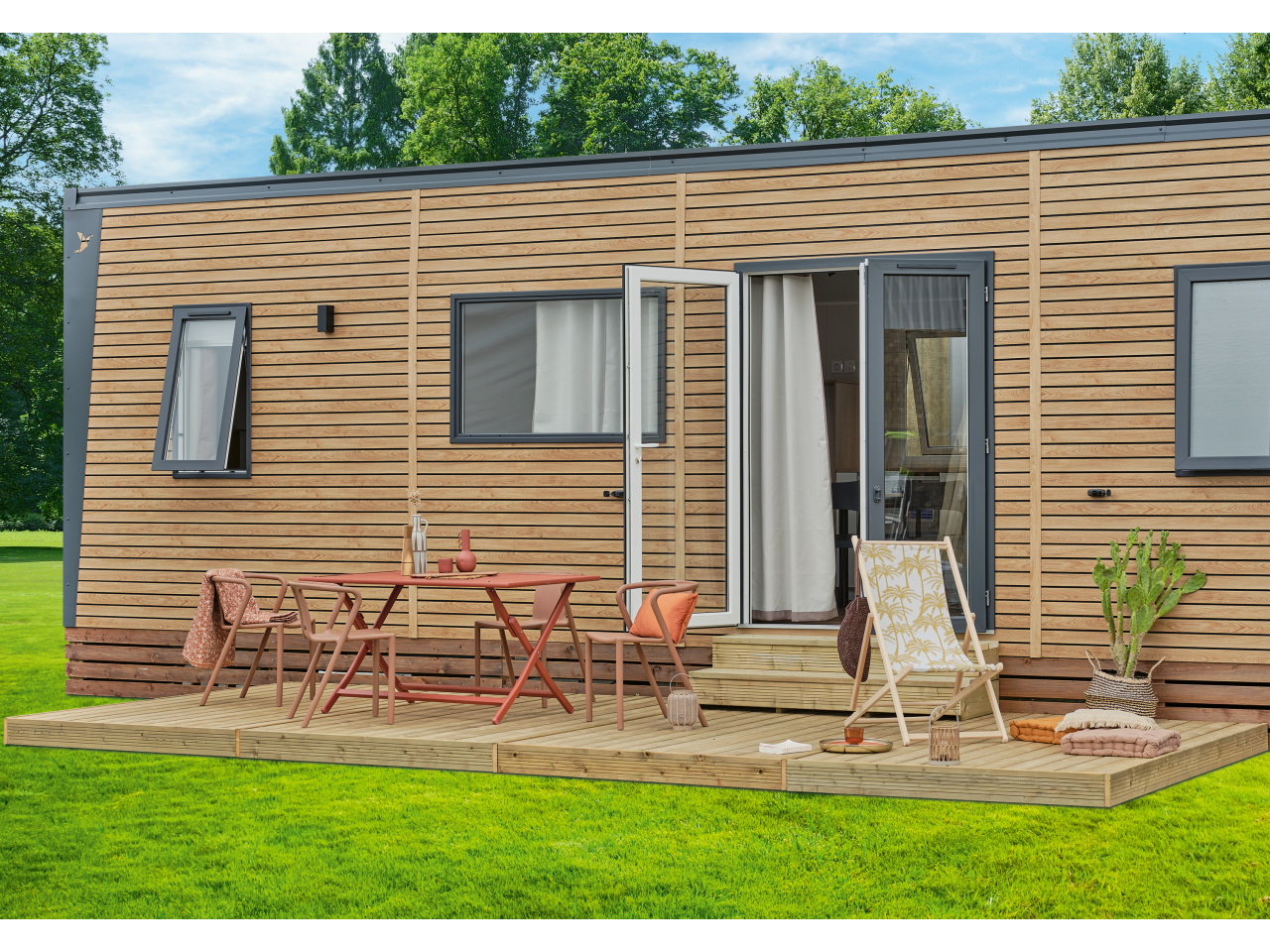 Devant votre mobil-home, à même le sol, la terrasse plancher reste une solution rapide !