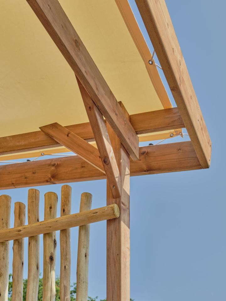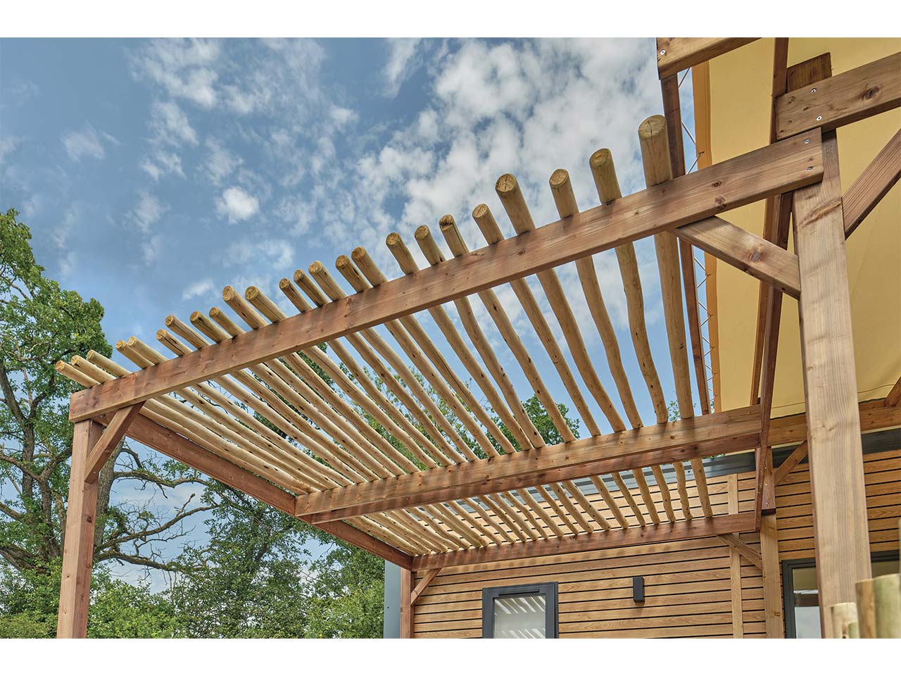En option, la pergola (version Eucalyptus ou brise-soleil) assure un confort supplémentaire, tout comme les pare-vues bois positionnables sur côtés et/ou en façade.
