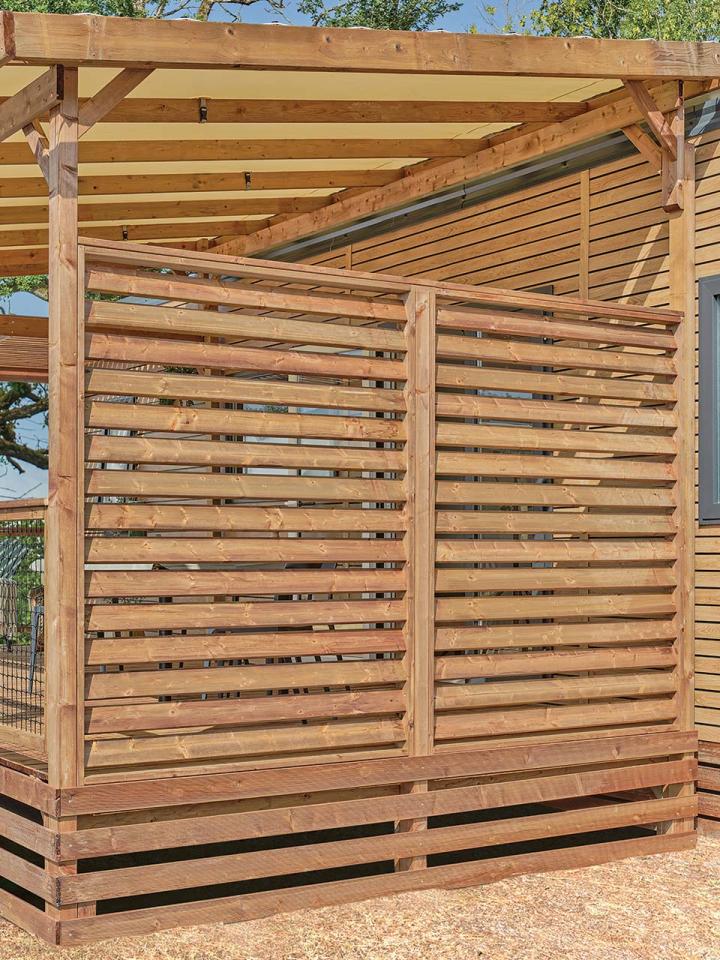 - Pare vue bois (livré monté) positionnable sur le côté non couvert et/ou en retour façade en eucalyptus ou lattes inclinées horizontales
