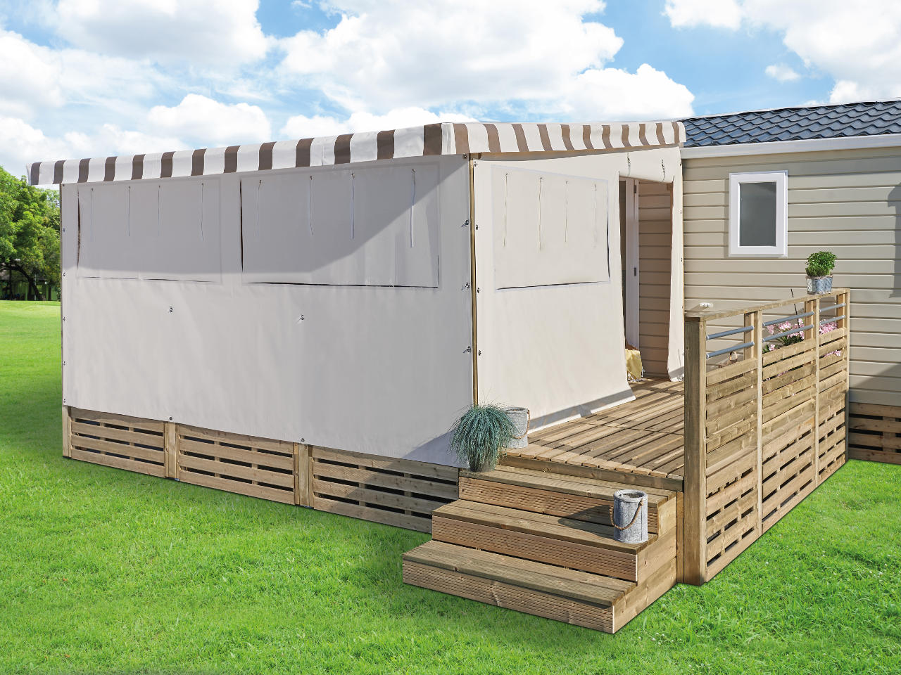 Toiles PVC Serge Ferrari pour côtés et façade terrasse bois mobil-home